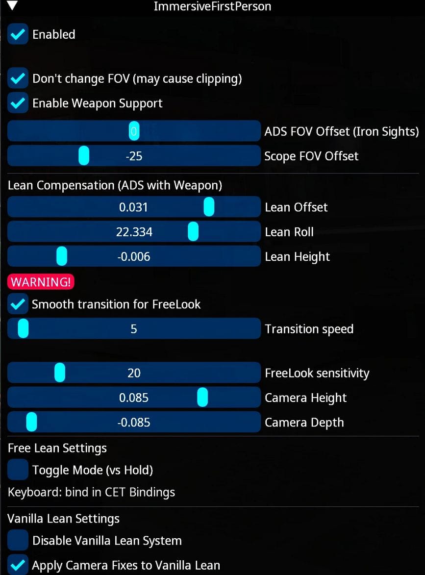 This mod aims to fix that as elegantly as possible by providing a completely overhauled first-person camera system with smooth procedural movement, freelook capabilities, and a robust lean system that actually works while aiming. It does this all seamlessly and you should only notice smoother, more immersive camera behavior.