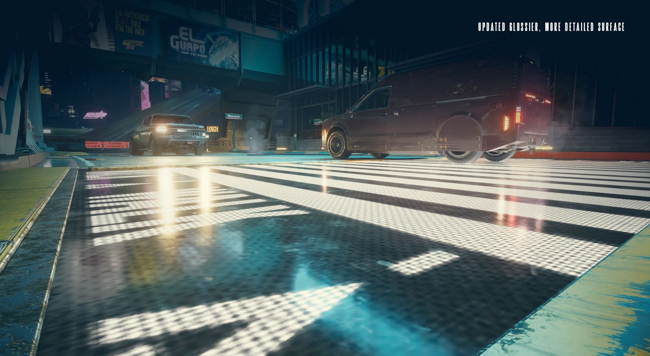 – There is a subtle texture seam visible in the centre of crosswalks, that no matter what I do in Wolvenkit, will not go away. I have a feeling its an actual mesh problem that is being extra-highlighted by the added resolution and emissive textures. I will try and figure out how to eliminate it, if anyone has any knowledge to share, it would be appreciated